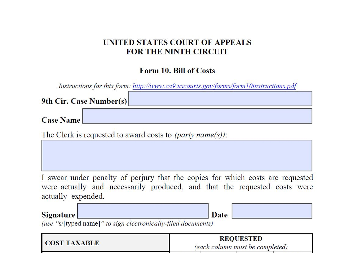 Use Form 10 to request costs within 14 days from the opinion or memorandum's file date.