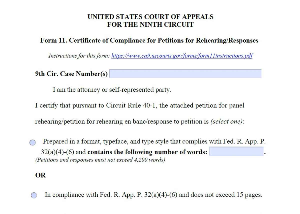 Use Form 11 to certify that your petition for rehearing or response to petition for rehearing complies with the Court's length limit.