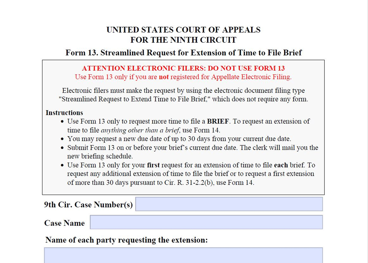 Pro se litigants: if you file only in paper, use Form 13 to request a first extension of time to file a brief, up to 30 days.