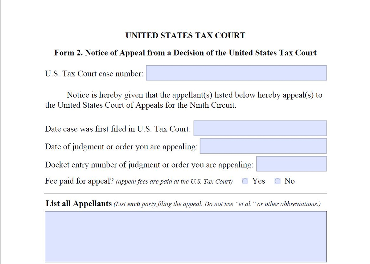 Form 2. Notice of Appeal from a Decision of the United States Tax Court
