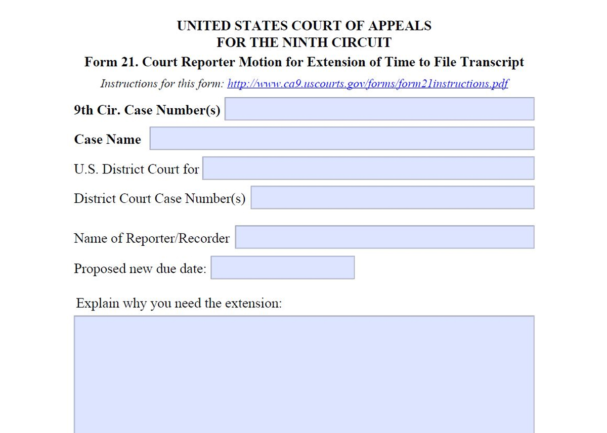 Court reporters: use Form 21 to ask for an extension of time to file a transcript.