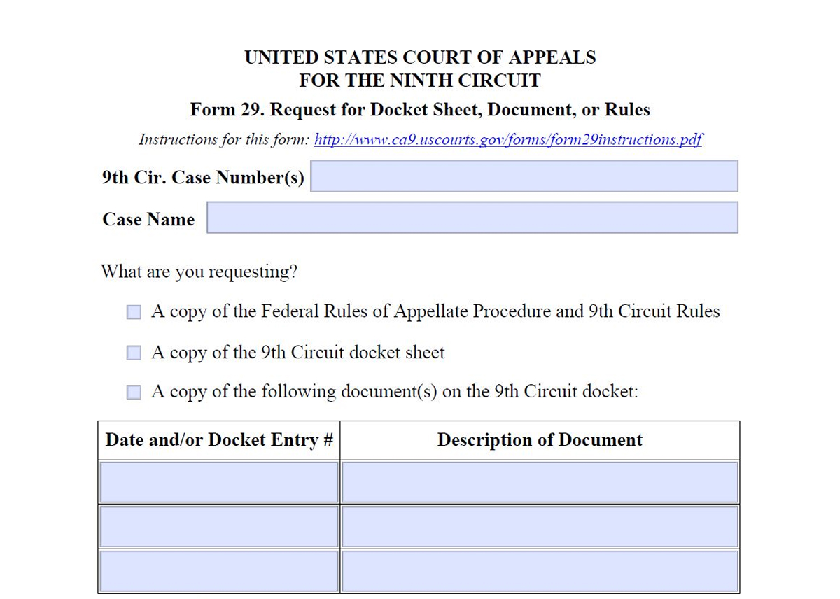 Form 29. Request for Docket Sheet, Document, or Rules