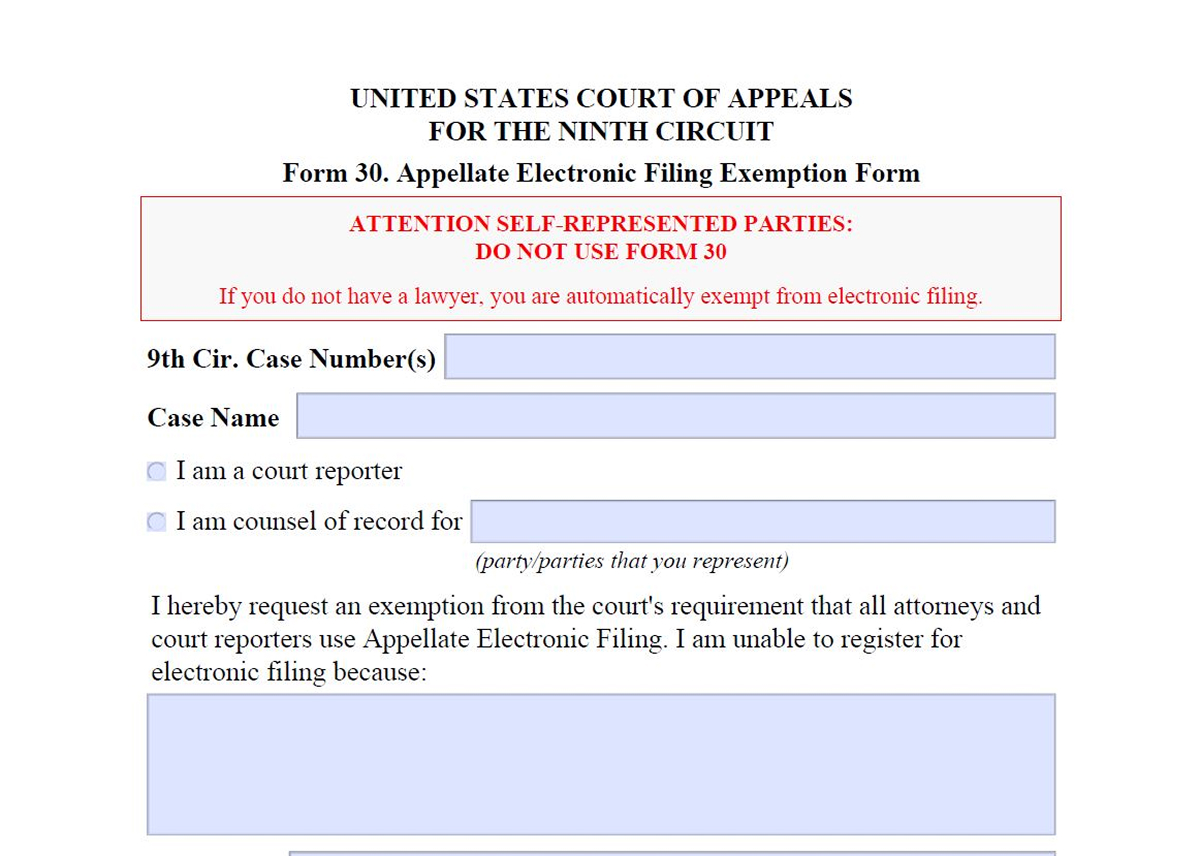 Attorneys and court reporters: use Form 30 to request an exemption from Appellate Electronic Filing.
