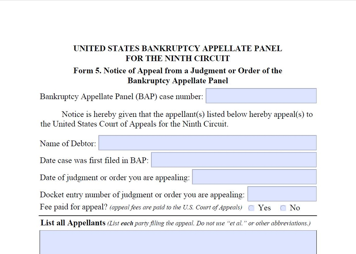 Use Form 5 to appeal a Bankruptcy Appellate Panel judgment or order.